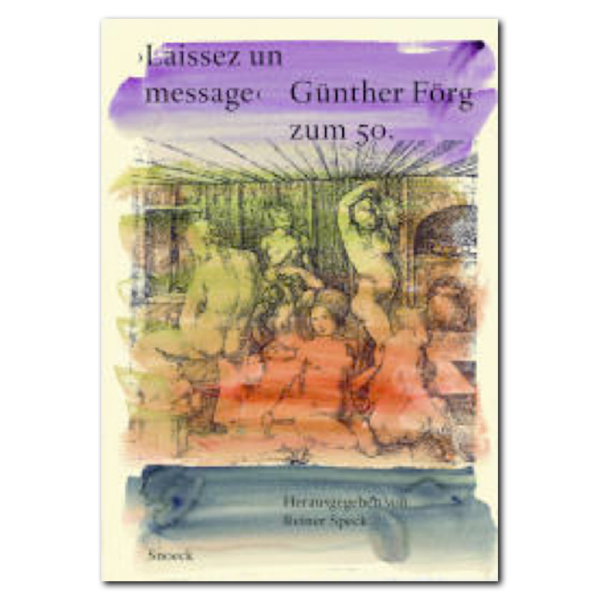 Als Günther Förg sein 50. Geburtstag ausgerichtet wurde, verabredeten seine Freunde, mit Reiner Speck als initiierendem Herausgeber, ein Buch, das durch den Beitrag mit 50 Aquarellen von Günther Förg selbst, zum Künstlerbuch geworden ist. Ob nun aber einfühlsam, wie Rudi Fuchs ein Aquarell durchmißt, mit langem kunsthistorischen Atem, wie sich Siegfried Gohr dem Fenstermotiv annimmt, in heiterer Underground-Manier, wie Rudolf Schmitz ein Gedicht intoniert, oder im großen erzählerischen Tempo, wie sich Johannes Gachnang in einer warmen Mailänder Sommernacht aus dem Fenster beugt, stets kam es zu tiefen freundschaftlichen Annäherungen, die auf großem wie durchdringendem Sachverstand beruhten. Fast heiter dazu waren die Aquarelle, erste Hinweise im Werk Günther Förgs darauf, daß er sich zwischen Eros und Thanatos zu behaupten verstand, wenn er Frauen als Schlafende, Badende oder Posierende mit hingehauchten Farbtupfern mal an- und wieder auszog.
